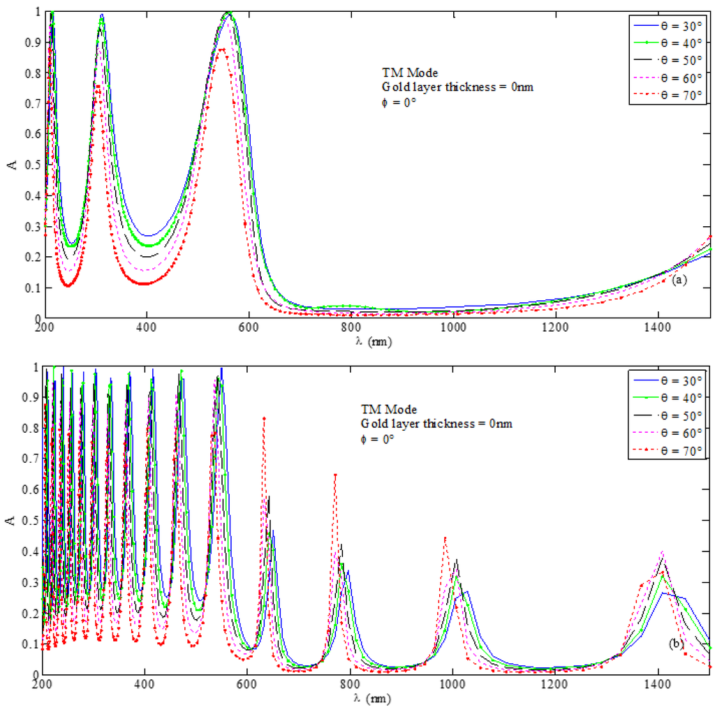 Absorption spectra obtained for under the TM wave excitation incidence and corresponding to (a) nm and (b) nm.