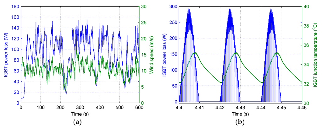 Wind speed and insulated-gate bipolar transistor (IGBT power losses: (a) averaged by the fundamental frequency vs. time; (b) instantaneous IGBT power losses and junction temperature in the steady state.