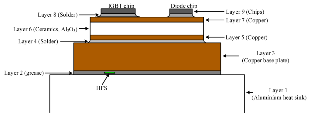 Power cycles generated in the IGBT module induce local temperature excursions over the multilayered structure of the device. Besides the vertical temperature gradient due to the thermal resistance of the module at a steady state, the dynamic temperature excursions of different magnitudes take place between the layers due to the different thermal capacitances of the materials. The latter causes the cyclic thermo-mechanical stress in the module, which induces wear-out mechanisms. The research of the failure mechanisms caused by the reason of different thermal expansion properties is carried out in [3,4,5,6]. However, the structural deformation of the module and the change in thermal parameters of the device result in changed heat conduction properties and the heat flux distribution pattern in the IGBT module.