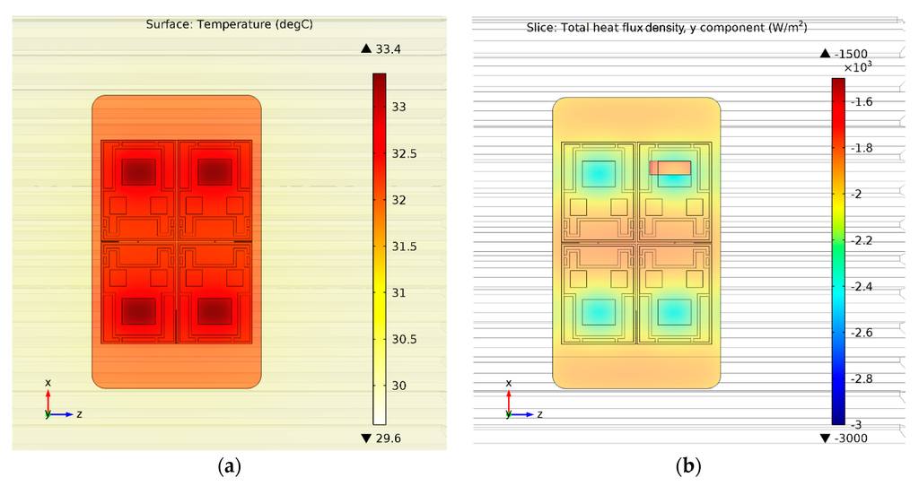 In the FEM modelling, the ambient temperature is assumed to be 25 °C. The heat generated in the IGBT (13.2 W) is dissipated from all four chips by forced convection from the fins of the heat sink, and the convective coefficient is 5 W/(m2·K). The surface temperature distribution is shown in Figure 5. The heat flux density through the thermal grease is shown in Figure 6, where the nonuniformity of the heat flux is observed. Thus, 13.2 W of the dissipated power in the IGBT corresponds to 33.2 °C of the chip temperature and 1870 W/m2 of the heat density dissipated through the HFS. The average heat flux density over the base plate surface is 2025 W/m2. Because the thermal conductivities of the thermal grease and the sensor are not the same, the heat flux through the HFS has an 8% lower density than the average density over the base plate. Obviously, the thermal conduction under the chip where the HPS is located is disturbed. In order to mitigate the disturbance of the heat conduction, a possible solution would be to place the HFS between the IGBT chips. However, in this case the influence of the other chips on the HFS should be considered. Another solution could be integrating the sensor close to the chip, but relatively low thermal conductivity and inappropriately high thickness of the sensor makes this solution unacceptable.