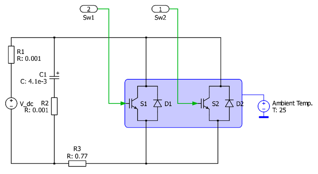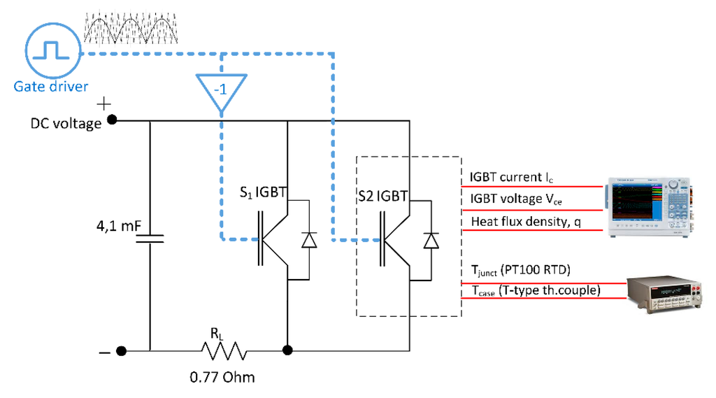 The HFS has been tested to monitor the dissipated power of the Infineon FZ400R17KE4 IGBT module. Two IGBT modules are connected in parallel to the direct current (DC) voltage source (Figure 7). The operating switching algorithm of the IGBT is based on sinusoidal pulse-width modulation (PWM) with a 1 kHz carrier and the fundamental frequencies of 0.1 and 7 Hz. The gate driver provides inverse operation of two IGBTs. Numerical modeling of the scheme in Figure 7 is carried out using PLECS blockset in Matlab Simulink (Figure 8).