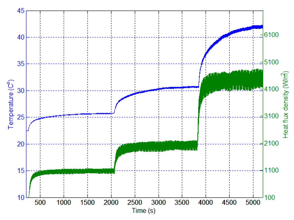 A heat measuring method based on temperature transients is adopted by thin film resistance temperature devices (RTD), coaxial thermocouples, and calorimeters [17,18]. In order to measure the heat flux as a function of time, it is necessary to manage the temperature history by the methods discussed in [19]. The basic principle of the methods in [19] is based on the proportionality of the heat flux to the temperature gradient. However, it is difficult to obtain reliable measurements using these methods, since they assume a one-dimensional heat transfer and uniform temperature distribution as it changes only with time.