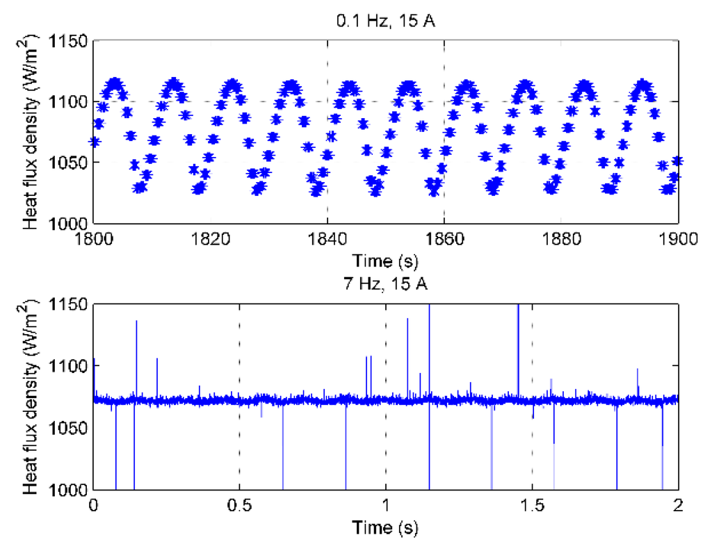 In Figure 11, the measured heat flux densities at 0.1 and 7 Hz fundamental frequencies are presented. The heat flux density has a form of half-wave sinusoids with the periods of 10 and 0.14 s, respectively. The heat flux density at 0.1 Hz was measured by the Keithley 2700 data logger with an average sampling time of 0.13 s, and the heat flux density at 7 Hz was recorded by a DL850 Scope Corder with a 0.2 ms sampling time. Thus, significant noise content is visible at 7 Hz.