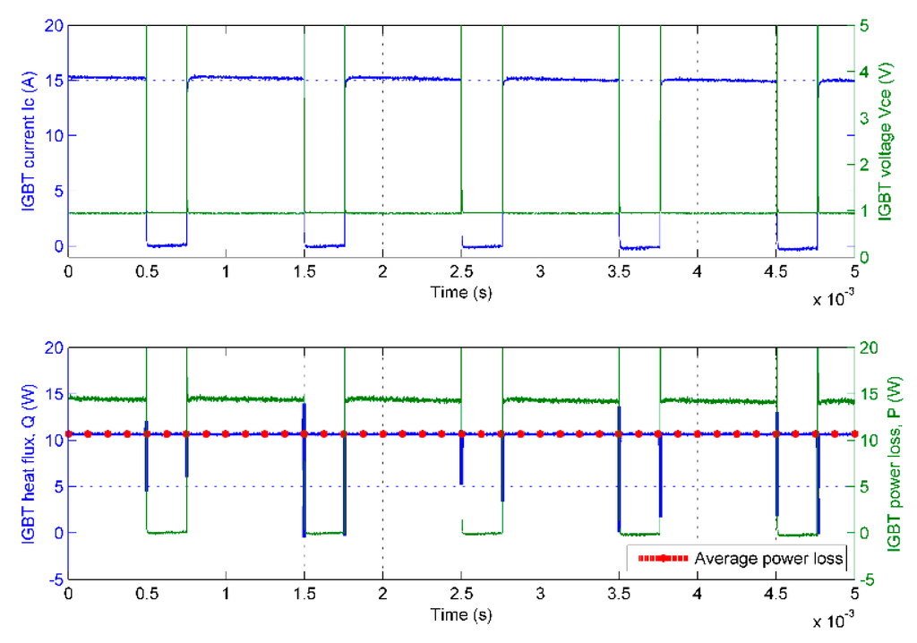 The collector-emitter voltage Vce and the collector current Ic of the IGBT were measured to obtain the instantaneous IGBT power loss Ploss and to make a comparison with the heat flux Q.