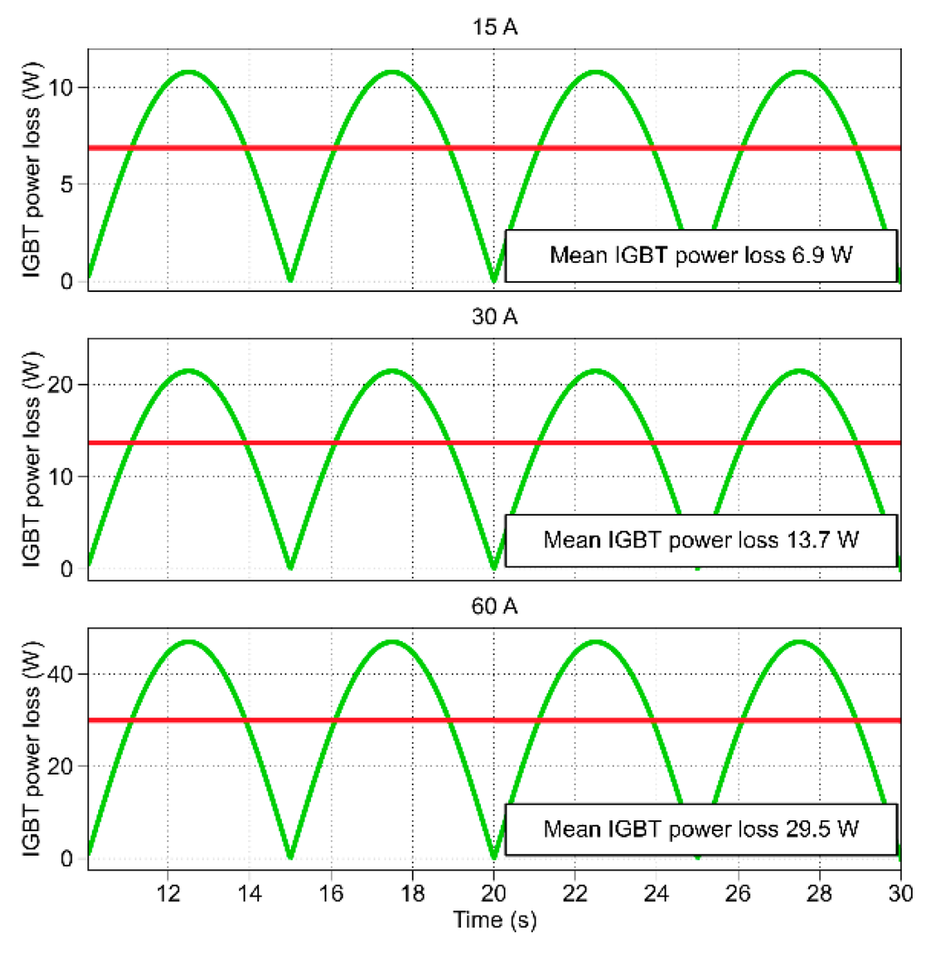 The IGBT collector-emitter voltage Vce and the collector current Ic, measured within a 5 ms time to cover the IGBT switching are shown in Figure 12. The corresponding instantaneous and average power losses calculated based on Vce and Ic and the measured heat loss Q are presented and shown to be equal. In Figure 13, the waveforms of the IGBT power losses modeled in PLECS (Figure 9), averaged by the switching frequency at 15, 30, and 60 A load current, are presented. Here, the power losses are formed as half-waves of sinusoids. The average values at 15, 30, and 60 A are 6.9, 13.7, and 29.5 W, respectively.