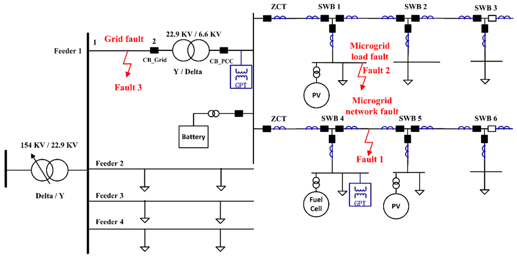 Each feeder had a zero-sequence current transformer (ZCT) to measure the zero-sequence currents, because it is almost impossible to calculate the zero-sequence currents from the phase currents. The zero-sequence CT used has a ratio of 200mA/1.5 mA, which is the typical ratio used in South Korea. In each SWB, three ZCTs were installed. In the load bus of SWB4, there was a GPT. The microgrid is shown in Figure 1.