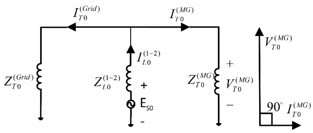where is the zero-sequence current angle and is the zero-sequence voltage angle. Figure 2 shows a simplified zero-sequence network for the grid SLG fault together with the corresponding phasor diagram. The zero-sequence voltage leads the zero-sequence current by 90° at the primary winding of the microgrid step-down transformer; thus, the zero-sequence angle difference was −90° in the case of a grid fault. The zero-sequence network is described using the following notation: