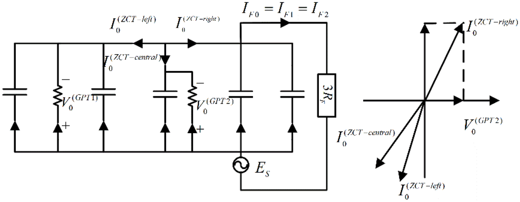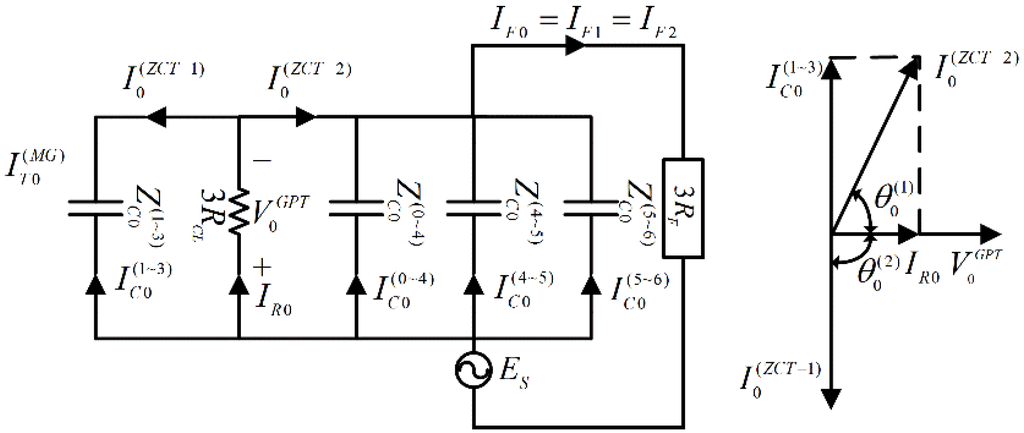 Figure 3 shows simplified zero-sequence networks together with the corresponding phasor diagram for the microgrid, with the faults shown in Figure 1 using the following notation: