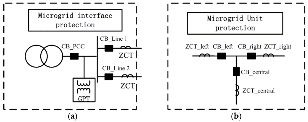 The microgrid unit protection is shown in Figure 5b. The microgrid unit protection can obtain the required information from three ZCTs installed at the SWB. The microprocessor is situated locally (SWB) and can detect the fault direction and send the information to the microgrid control center.