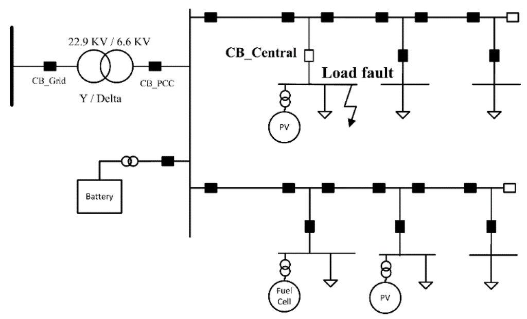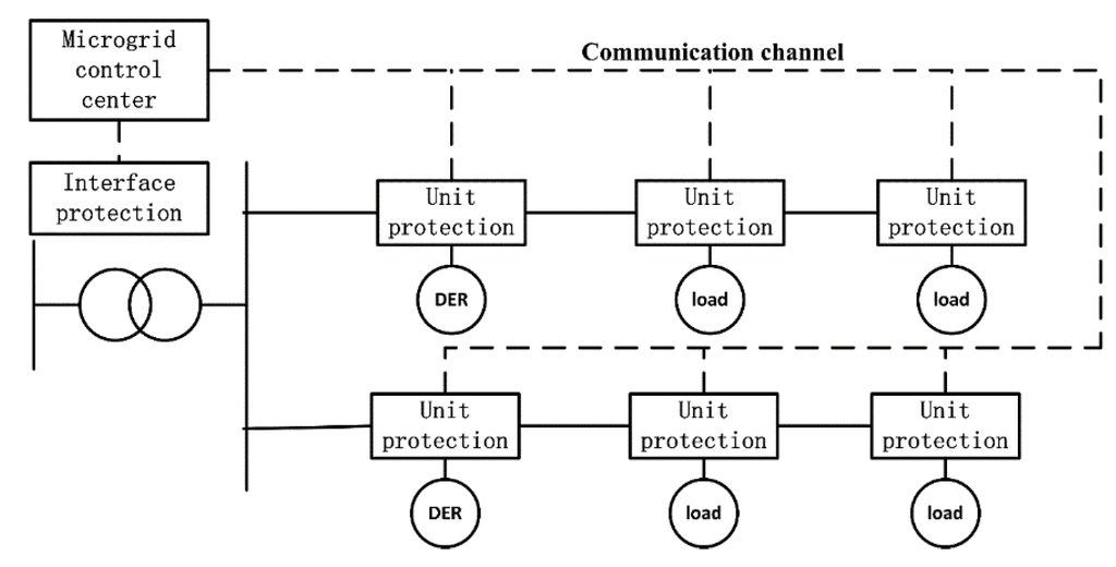 As shown in Figure 6, there is a microgrid control center and interface protection in the substation. At each SWB, there is microprocessor for unit protection (DER or load). The configuration of the protection system is shown in Figure 6. Detection and isolation of the fault section can be realized using the protection system. The coordination of interface protection and unit protections can help isolate the smallest fault section. There is a control center to control the microgrid. The fault direction signal is exchanged between the interface protection and unit protections via a communication channel.
