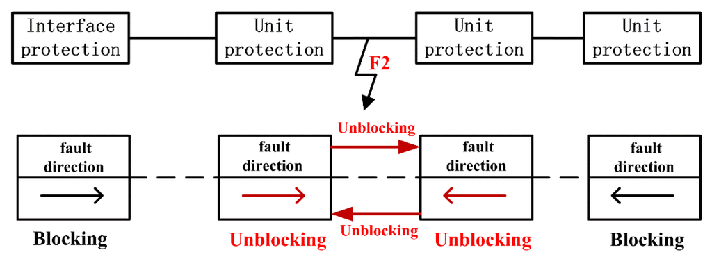 As shown in Figure 9, if the fault direction signal of the unit protection and its upstream/downstream unit protection are different, the unit protection will send an unblocking signal to its upstream/downstream unit protection. If the fault direction signal of the unit protection and its upstream/downstream unit protection are the same, the unit protection unblocking operation will not begin. If the unit protection is unblocked, it will issue a trip command to the feeder CB of the local SWB.