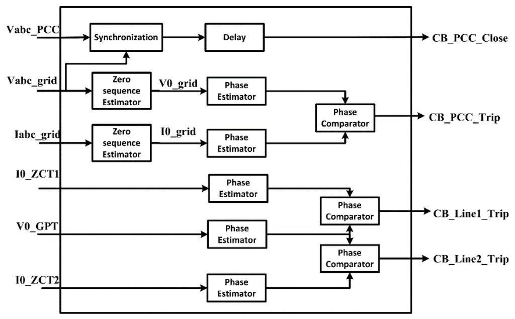 Figure 11 shows a simplified block diagram of the interface protection system, including the functional modules. The protection system consists of a grid fault detection module, a microgrid fault detection module, and a microgrid reconnection decision module. The protection system is based on zero-sequence components. At the primary winding of the step-down transformer, a zero-sequence estimator was used to determine the zero-sequence voltage and the zero-sequence current. At the secondary winding of the step-down transformer, the zero-sequence voltage and current can be obtained directly from the GPT and the ZCT.