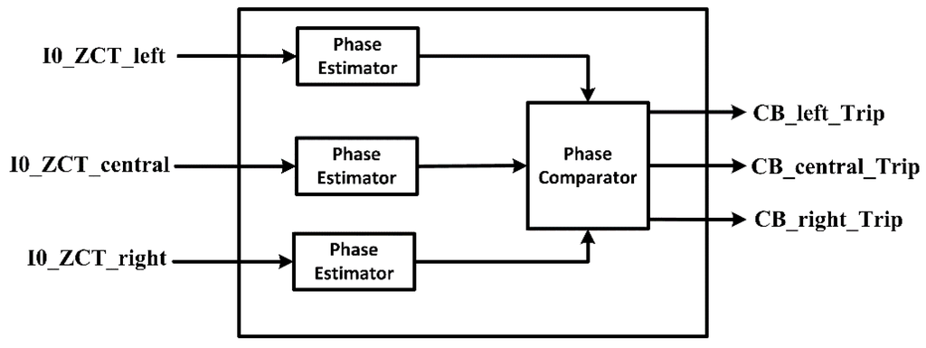 Figure 12 shows a simplified block diagram of the unit protection. The zero-sequence current can be obtained directly from the ZCTs. The protection can indicate the direction of the fault by comparing the zero-sequence current directions. The directions of two zero-sequence currents are similar while the other zero-sequence current angle direction is reversed. The reversed one indicates the fault direction.
