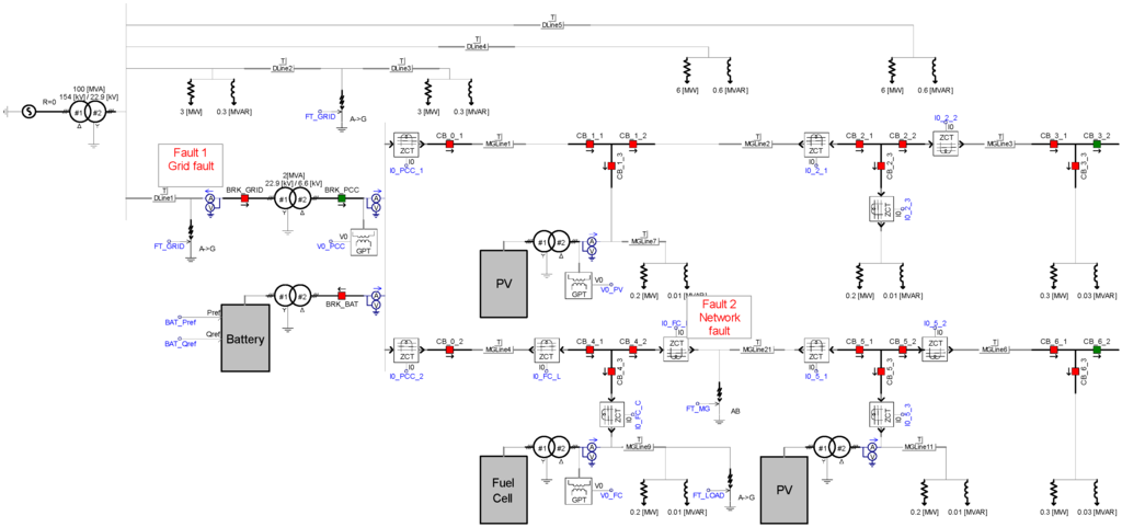 To investigate the effectiveness of the protection method, a low-inertia microgrid was simulated using Power System Computer Aided Design (PSCAD)/Electromagnetic Transients including DC (EMTDC), as shown in Figure 13. The grid was represented by a 154-kV bus with a short-circuit capacity of 100 MVA. The distribution grid had four feeders, where each supplied a 6.02 MW load (PF 0.99). At feeder 4, there was a step-down transformer for a microgrid. In the microgrid, four DERs were connected to the system. The battery, two PV bus, and fuel cell were all inverter-based DERs.