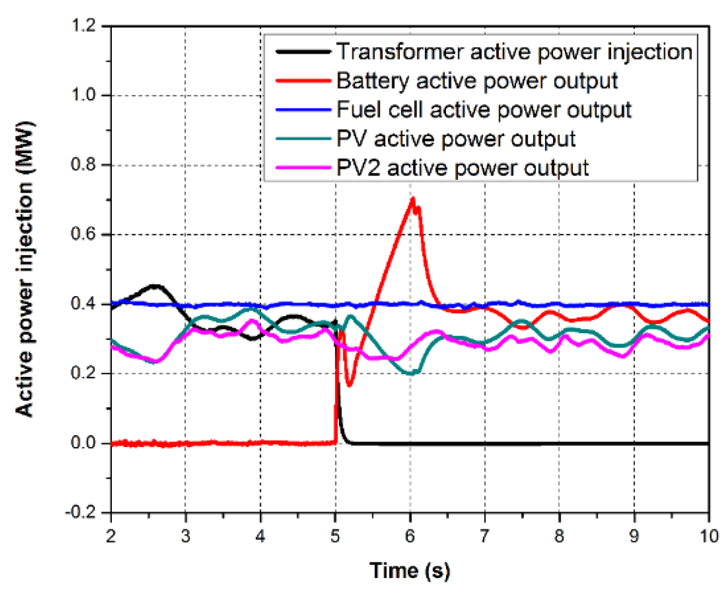 Figure 14 shows the simulation results. In grid-connected mode, the battery shuts down, but the two PV DERs and the fuel cell DER continued to operate in active-reactive power (P-Q) control mode [26,27,28,29]. When operation of the microgrid changed from grid-connected to autonomous mode at 5 s, the battery DER discharged to maintain power balance in the microgrid [30,31,32,33]. The voltage and frequency of the microgrid were regulated using droop control. The simulation results show that the microgrid worked well in both conditions [34,35,36].