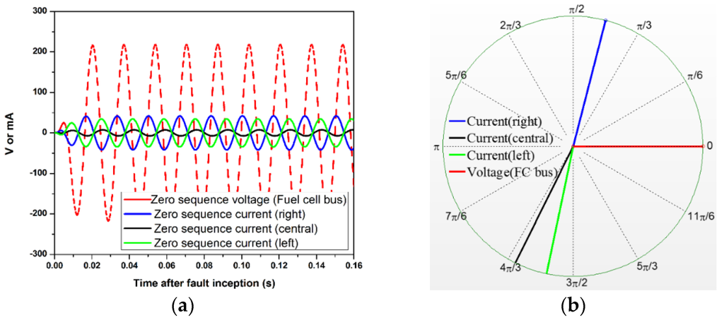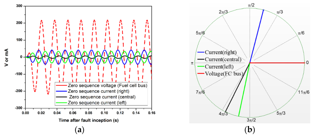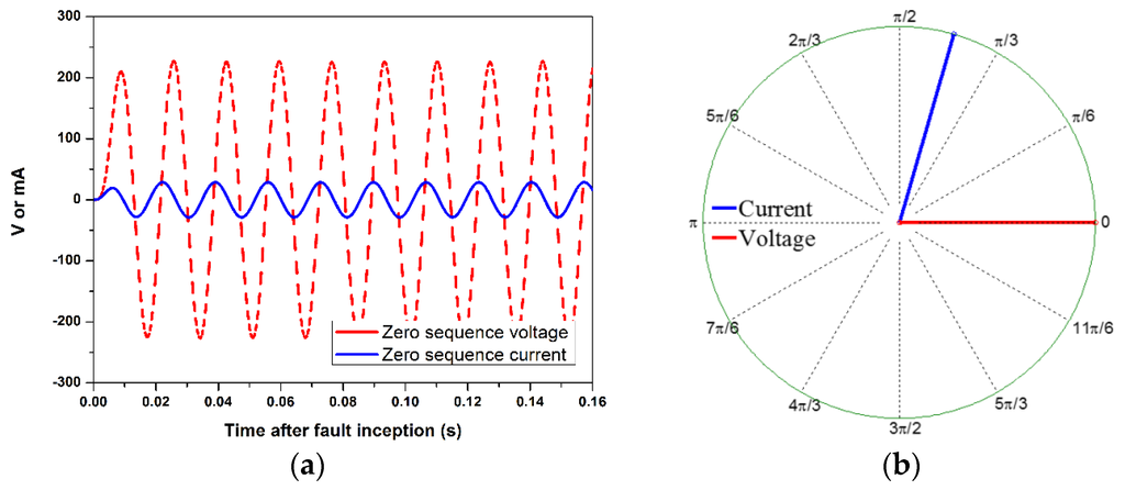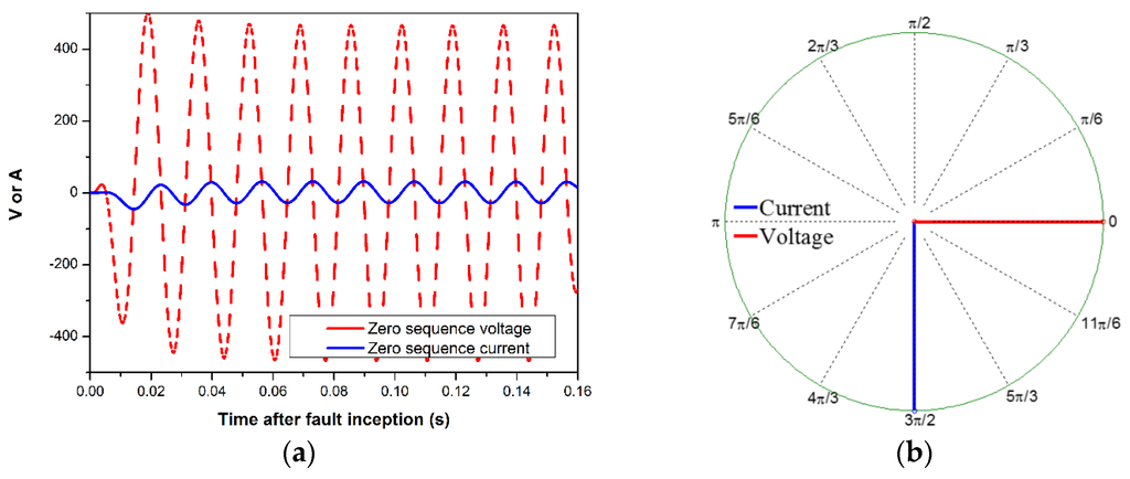 The zero-sequence voltage and current at the secondary winding of the step-down transformer in the case of a microgrid fault in grid-connected mode: (a) Zero-sequence voltage and current; (b) Phase relation.