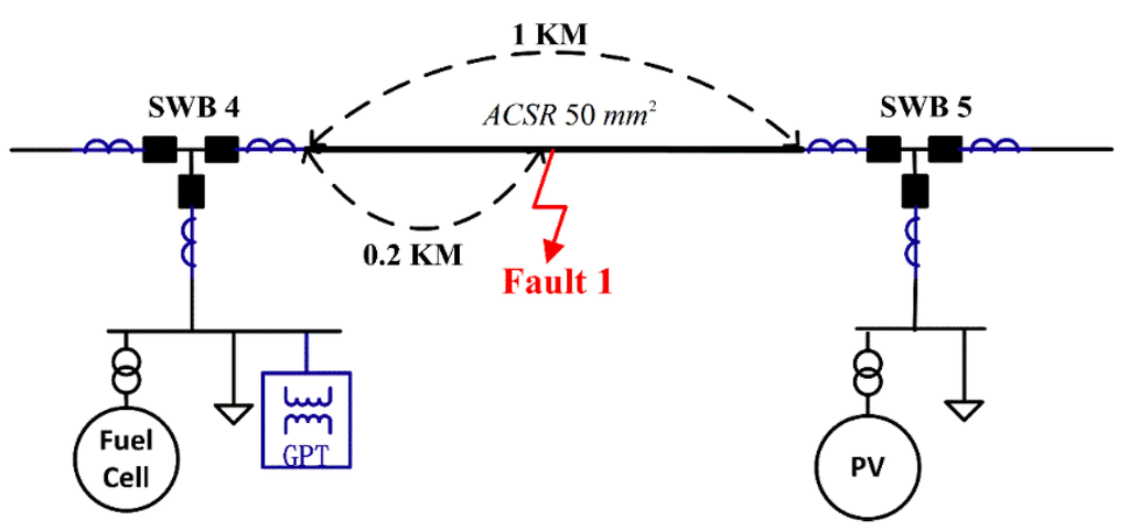 When the microgrid fault occurs on the right side of the SWB4, the fault direction can be detected readily, using the angle difference between the zero-sequence voltage angle and zero-sequence current angle, if there is a GPT installed at the load bus of SWB4. The zero-sequence angle difference drops to between 60° and 90° in the fault direction. With a direction that is functioning normally, the zero-sequence angle difference is between −180° and −90°. If there is not a GPT installed at the load bus, the three zero-sequence current angle directions can be compared to indicate the direction of the fault. Angle directions of two zero-sequence currents are similar, while in the other zero-sequence current the angle direction is reversed. The reversed one indicates the direction of the fault. Figure 4 shows simplified zero-sequence networks together with the corresponding phasor diagram for the microgrid. In the case of a microgrid network fault, two SWBs near the fault position can locate the fault section. In the case of a microgrid load fault, the protection installed at the SWB can indicate the fault position itself.