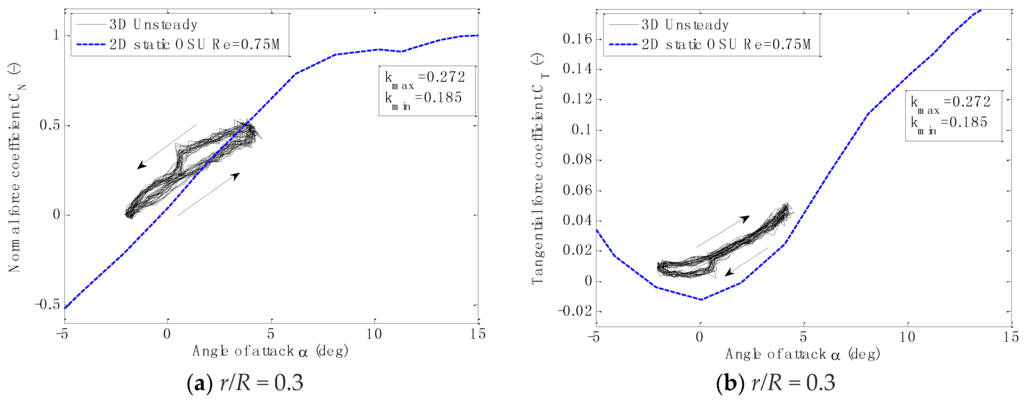 When a converged solution in the unsteady angles of attack is obtained for all radial locations and the blade azimuth angles, the unsteady aerodynamic lift and drag coefficients are determined by Equation (9). The time-averaged results obtained by this approach (see Subsection 5.2) agree well with results of Sant et al. [14,15]. Slight differences can be seen as the latter work only considered an average of 36 cycles for CN, CT, and QNORM as input values.