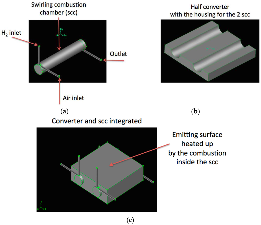 This work reports the performance of an energy converter characterized by an emitting parallelepiped element with inside two, three, or five swirling connected combustion chambers. In particular, the idea is to adopt the heat released by H2/air combustion, occurring in the connected swirling chambers, to heat up the emitting surfaces of the thermally-conductive emitting parallelepiped brick. The final goal consists in obtaining the highest emitting surface temperature and the highest power delivered to the ambient environment, with the simultaneous fulfillment of four design constraints: dimension of the emitting surface fixed to 30 × 30 mm2, solar mode thermal efficiency greater than 20%, emitting surface peak temperature T > 1000 K, and its relative ∆T < 100 K in the combustion mode operation. The connected swirling meso-combustion chambers, inside the converter, differ only in their diameters. Combustion simulations are carried out adopting 500 W of injected chemical power, stoichiometric conditions, and detailed chemistry. All provide high chemical efficiency, η > 99.9%, and high peak temperature, but the emitting surface ∆T is strongly sensitive to the geometrical configuration. The present work is related to the “EU-FP7-HRC-Power” project, aiming at developing micro-meso hybrid sources of power, compatible with a thermal/electrical conversion by thermo-photovoltaic cells.