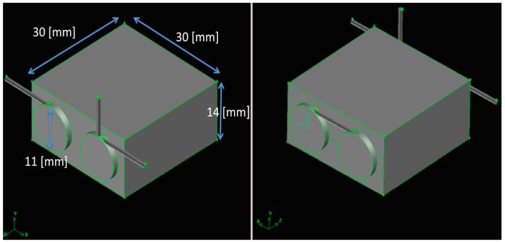 The energy converter is represented in Figure 1; it shows, separately, a swirling chamber, a thermally-conductive parallelepiped brick and their relative integration into the energy converter itself (overall dimensions are reported in Figure 2, Figure 3 and Figure 4).
