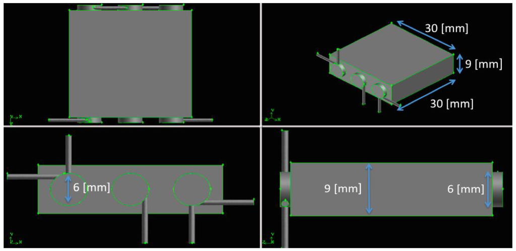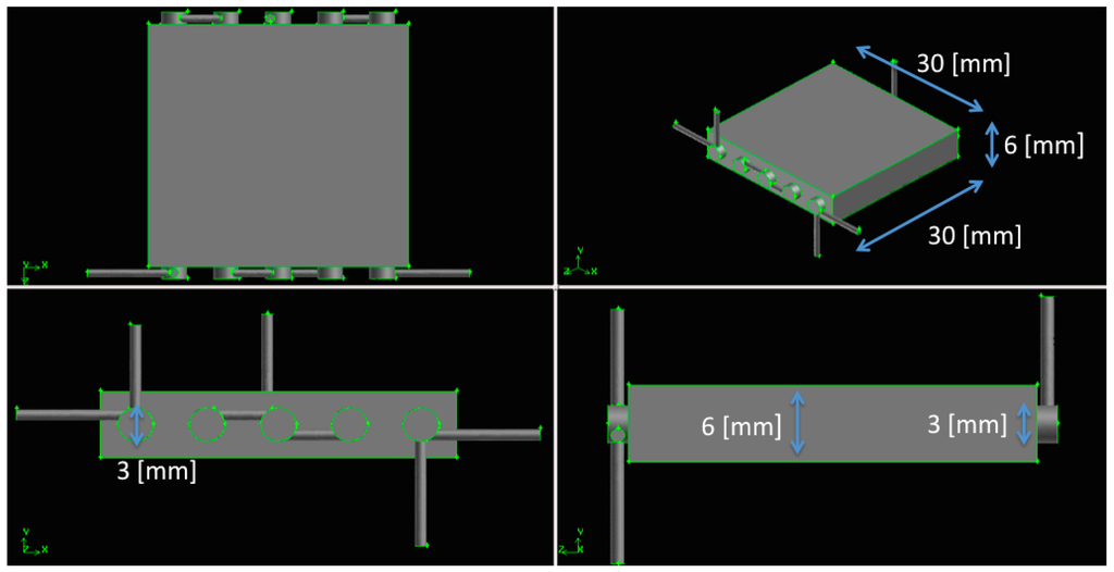 The combustion chambers, adopted in the three configurations, differ for their diameters (3-6-11 mm) while the axial length is fixed to 33 mm. Consequently, they are characterized by different aspect ratios (Z/D = 11-5-3) and by different total combustion volumes (about 1166-2798-6269 mm3). The converters have x-z fixed dimensions (30 × 30 mm2), while the thickness (y-dimension) is always 3 mm greater than the diameter, then 6-9-14 mm; the relative distance between the chambers is 4-4-3 mm. These geometrical characteristics are reported in the following Table 1.