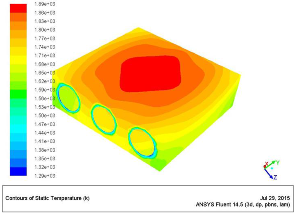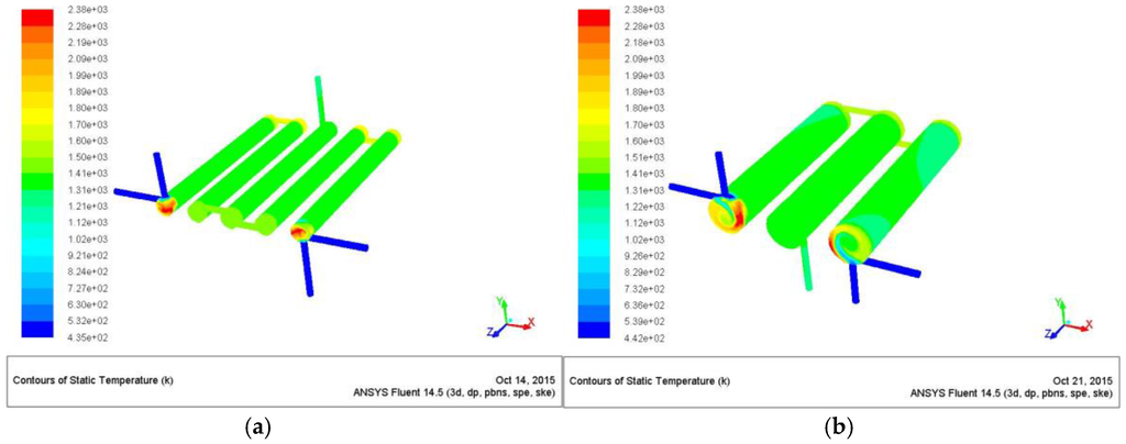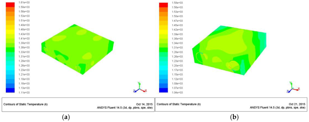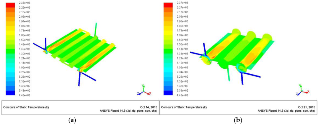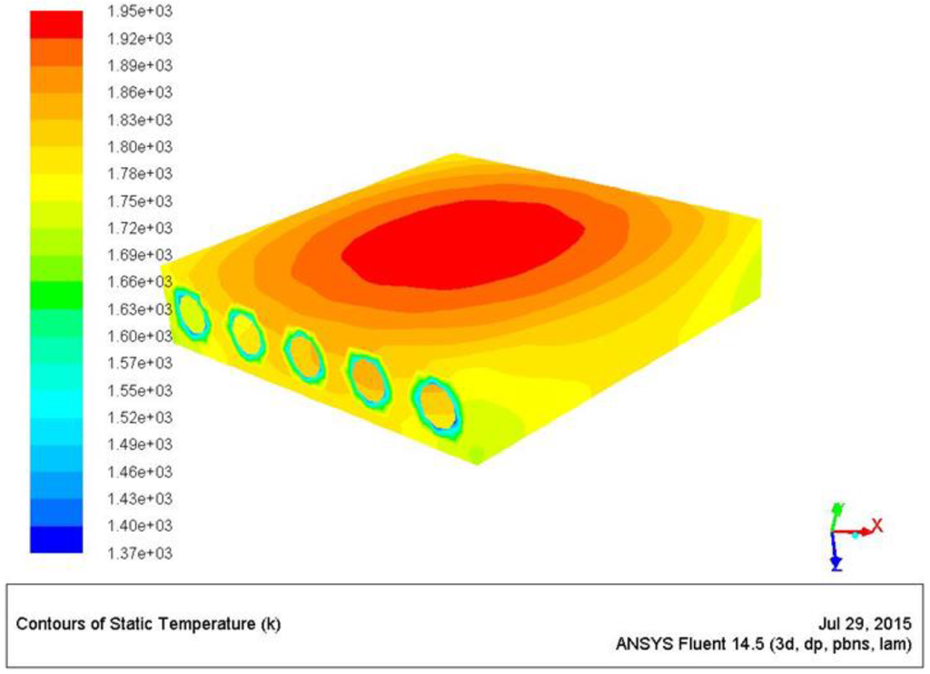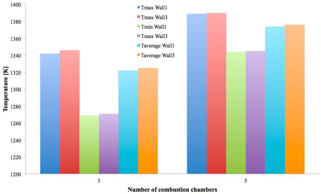 Figure 14 reports the temperature map of the emitting surfaces from which it is evident how the configuration with five chambers (Z/D = 11) performs better in terms of ∆T. In fact, this configuration figures out an external maximum temperature of 1390 K, and a delta of 45 K, compared to the Z/D = 5 configuration that predicts a maximum temperature of 1346 K and a delta of 75 K (see Table 5).
