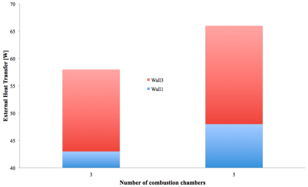 Both of the configurations fulfill the required performance (Tpeak emitting surface > 1000 K and ∆Temitting surface < 100 K). In fact, the Z/D = 11 (Z/D = 5) configurations reach, from the emitting surfaces “wall 3”, a peak temperature value equal to 1390 K (1346 K) and the ∆T = 45 K (∆T = 75 K). These performances indicate that both of the configurations are compatible with a thermal/electrical conversion by thermo-photovoltaic cells.