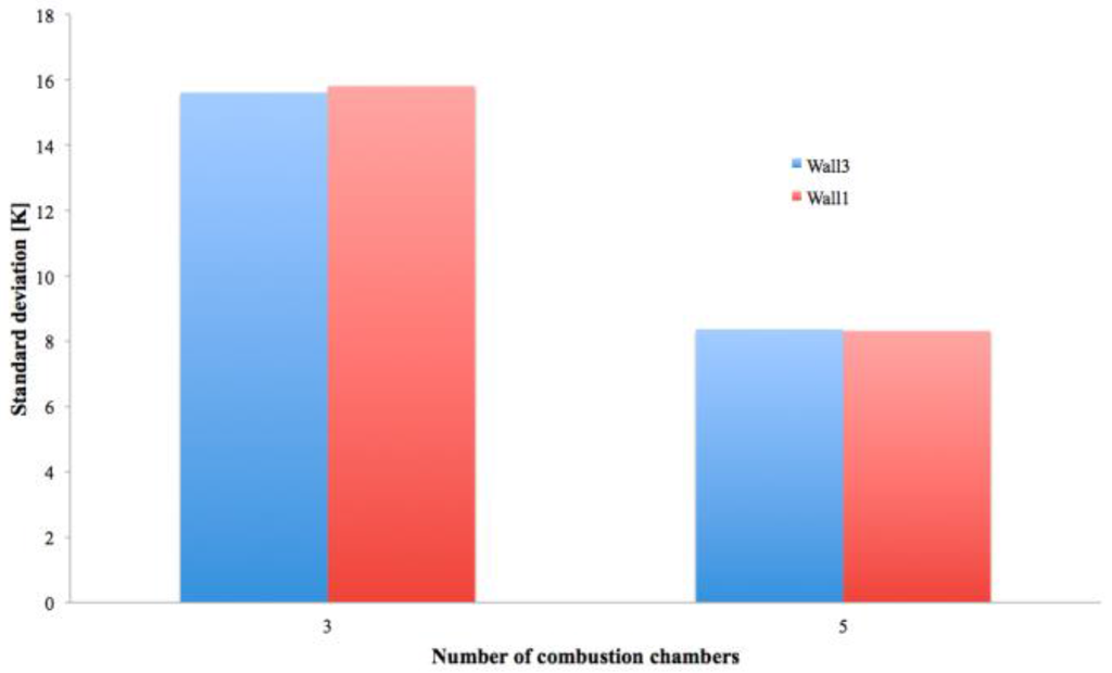 Figure 8 reports the power delivered to the ambient from “wall 1” and “wall 3”, Figure 9 reports the maximum, minimum, and the average temperature on “wall 1” and “wall 3”, while Figure 10 reports the standard deviation, σT, of “wall 1” and “wall 3” (the results are provided as a function of the number of chambers inside the converter, which is inversely proportional to the chambers diameter dimension, to the total thickness and, finally, to the Z/D aspect ratio).