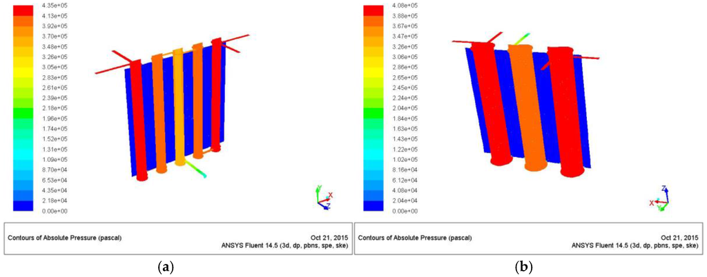 Figure 15 provides the overpressure map and shows that an inlet overpressure of about 3 atm, at steady state conditions, is required for both the configurations (the exhaust section is at ambient conditions, P = 1 atm). This result differs from what is reported in [1], where the simulation of two “not-connected” chambers, at the same exhaust pressure conditions, predicts a slight overpressure.