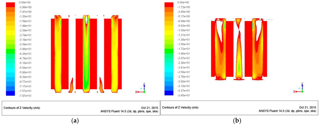 Z/D = 11 (a) and Z/D = 5 (b), Z-velocity map inside the chambers.