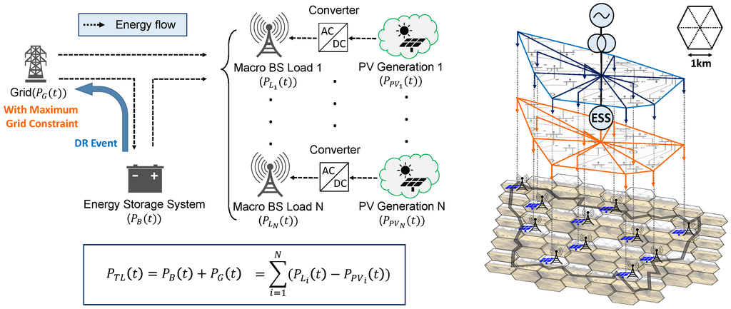 Recently, there has been growing concern that existing base stations (BSs) without multiple power sources cannot handle power crisis, and thus mobile operators pay great attention to the architecture of sustainable BSs, which leverages renewable energies with an energy storage system (ESS) [1,2]. In this regard, the viability of energy harvesting with ESS and solar panels at BS [3], and different types of power solutions for off-grid BS [4] are under study. This work was triggered by the fact that conventional BSs using the grid as major power source indeed cannot cope with emergent power failure caused by power system malfunctions or natural disasters. As an example, in 2012, India suffered from the largest electrical blackout in history, which affected almost 620 million people, or roughly 10% of the world’s population [5]; infrastructures including communication facilities were not available from 24 to 50 h. The damage could have been greatly reduced if there had been more assistant power resources such as ESS, photovoltaics (PVs), wind turbine and diesel generators. Specifically, BSs in cellular networks are important national infrastructure that is closely related to industrial facilities of high priority for stable operation.