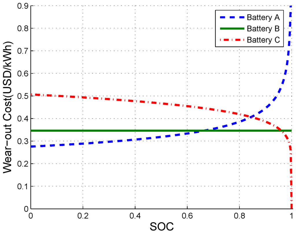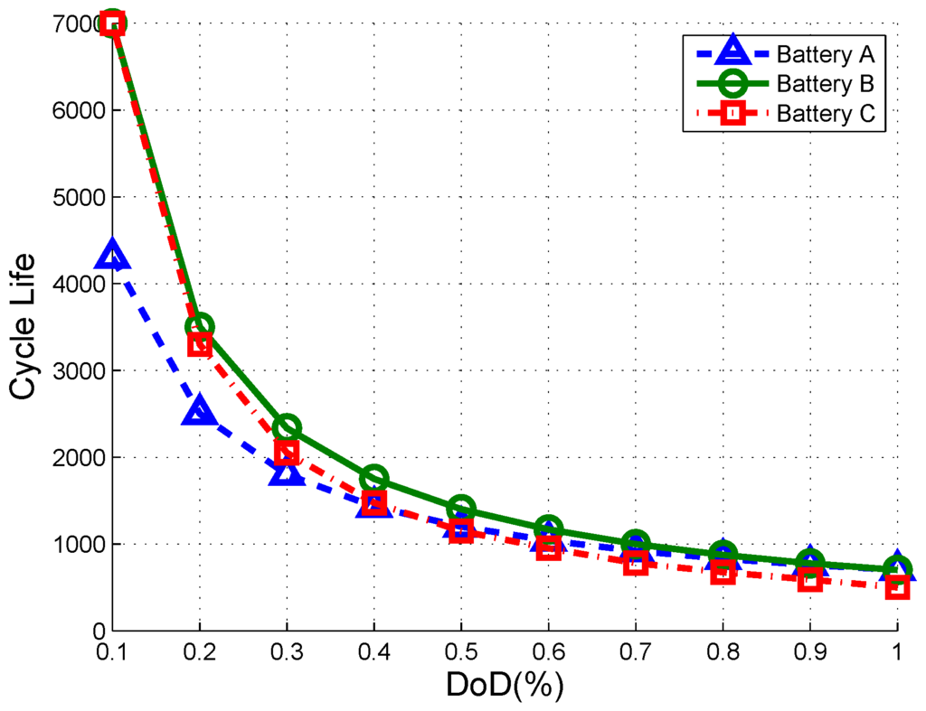 In this regard, previous works investigated battery degradation from various viewpoints [17,18,19,20,21,22,23,24]. The work in [17] gave an overview of mathematical relation between battery characteristics with respect to different battery types. In [18,19], capacity loss for lithium-ion batteries is calculated based on empirical parameters. The authors in [20] used an effective cumulative ampere hour throughput from manufacturer’s data, and proposed a method that extrapolates manufacturer’s data on a log-log scale for the effect of fractional discharge cycles [21]. According to the Peukert’s law, the product of DoD and the number of cycles becomes some fixed number, called Peukert lifetime constant [22]. Similarly, a decreasing exponential function has been proposed to capture battery degradation cost [23]. Furthermore, Han [24] have introduced the wear-out density function based on the cycle life data provided by the battery manufacturer; wear-out density function captures degradation cost density as a function of state of charge (SOC).