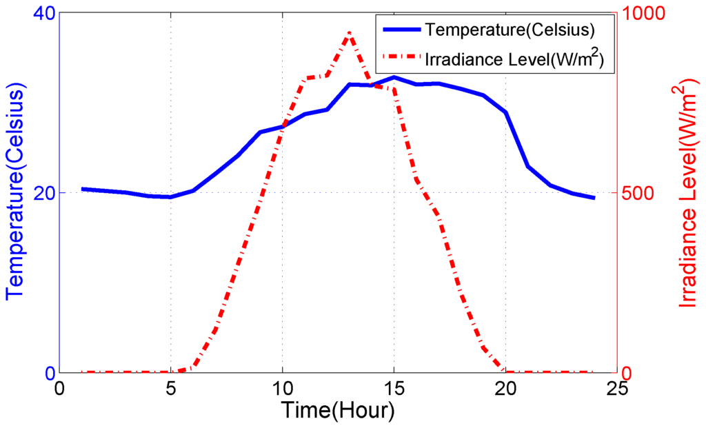 A sample of daily average temperature and irradiance level across a 24 h period in summer season.