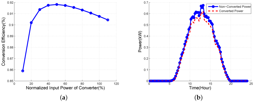 where the normalized input power of converter is defined by the rated power of converter over the input power . Figure 5b describes the sample of PV output power profile during 24 h after converting shown in Figure 5a.
