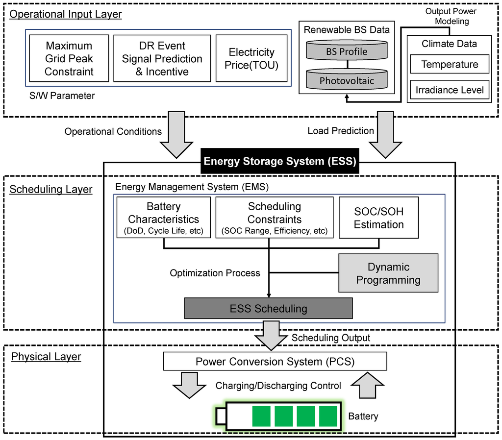 - Physical layer: Based on the scheduling result from the scheduling layer, the power conversion system (PCS) performs practical ESS charging and discharging.