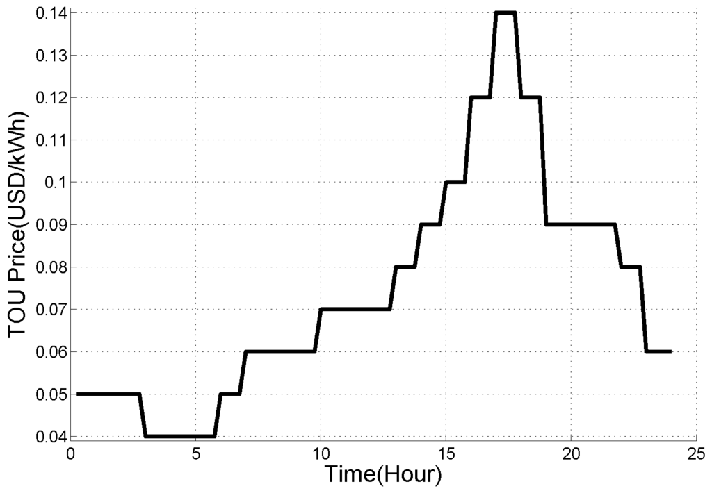 Figure 7 shows sample profiles of 50 macro BS loads and PV generations that have deviation of ±5%, respectively. Since we consider a system model where multiple BSs equipped with PV generators share an ESS, we intend to take into account the realistic measured value about load and generation varying depending on the location. The highest peak of BS load curve is during the evening, while that of PV generation is in the middle of the afternoon. Since ESS charge and discharge energy loss is dominant compared with the distribution line loss [30], overall energy loss of ESS system is set to 15% of the rated battery capacity, i.e., efficiency of ESS system is 0.85. All available load data in this paper are taken every 15 min over one day (24 h). Following this, time step in our simulation is 15 min, and we have 96 time steps during 24 h. As can be seen from Figure 8, we utilize the practical day-ahead electricity price from California ISO (CAISO), which has $0.14/kWh as highest price and $0.04/kWh as lowest price in this paper [12]. Battery SOC stays within preset upper and lower limits (upper = 0.9, lower = 0.1) to prevent suffering from high stress at both ends of the SOC; this is widely adopted in the lithium-ion battery industry. The rest of the parameters used in the simulations are summarized in Table 3.