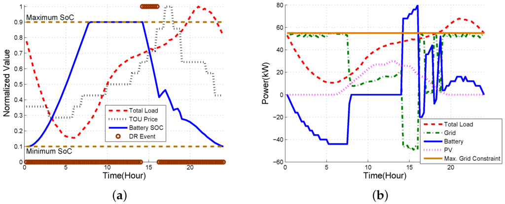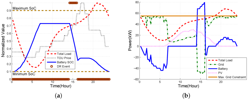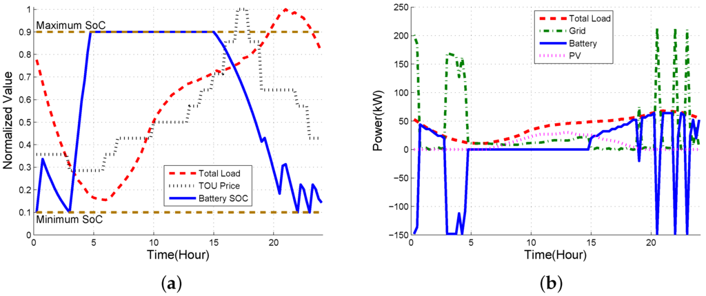 Figure 9 shows the results of basic optimal scheduling when TOU is considered, but without considering DR, peak shift and battery wear-out. Since battery wear-out is not reflected in the optimal scheduling computation, the operator can only benefit from the difference between TOU tariffs. Thus, we observe that charging and discharging enables the operator to get a profit from a TOU tariff regardless of battery degradation, even if several peaks occur over a high demand period. Note that since battery wear-out is not considered in Case 1, DP may choose the charging and discharging path out of several equal cost paths when a tie occurs, which may lead to unnecessary frequent charging and discharging unless a deliberate tie-breaking rule is included. We will see that our solution considering battery wear-out in Case 3 does not have this issue.