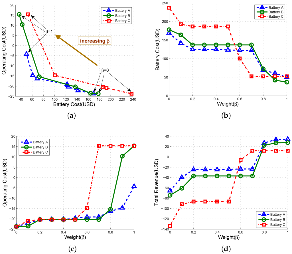 Trade-off relation and cost comparison with respect to the : (a) trade-off between operating and battery cost; (b) battery cost; (c) operating cost; and (d) total revenue.