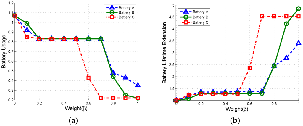 Next, Figure 13b shows the relation between and the battery lifetime extension, which is defined as where is defined in (26) such as:
