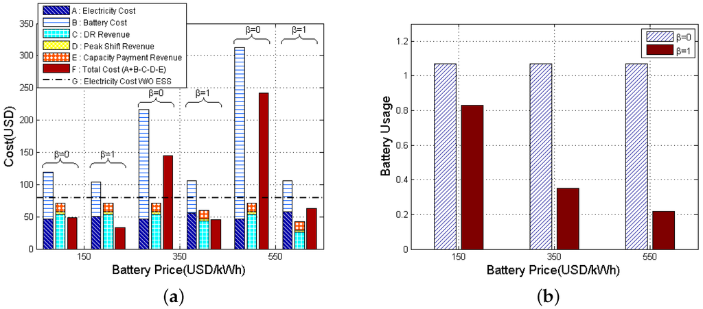 Now, we analyze the total cost depending on the battery usage and battery price. Figure 14a compares the costs in detail for different battery prices ($150/kWh, $350/kWh and $550/kWh) and with/without wear-out consideration ( = 0 or 1) for the case of battery A. In each case, three bars consist of various costs or revenues as follows: electricity cost (A), battery cost (B), DR revenue (C), peak shift revenue (D), capacity payment revenue (E) and total cost (F = A + B − C − D − E). The electricity cost without ESS (G), which appears in (25) as , is denoted by the horizontal dash-dot line. Thus, if total cost (F) is below G, using ESS is beneficial, and vice versa. We can see that when battery price is $350/kWh or $550/kWh, exhibits excessive battery cost, and using ESS is economically disadvantageous. However, the case of substantially reduces battery cost while DR revenue loss and electricity cost increase are both negligible. Consequently, the total cost decreases significantly compared to the case of , which shows the benefit of the proposed solution. In Figure 14b, we observe that the battery usage in the case of significantly decreases as the battery price increases. Comparing with the case of , battery usage is reduced by 22.4%, 67.3% and 79.4% for the battery price, $150/kWh, $350/kWh and $550/kWh, respectively.