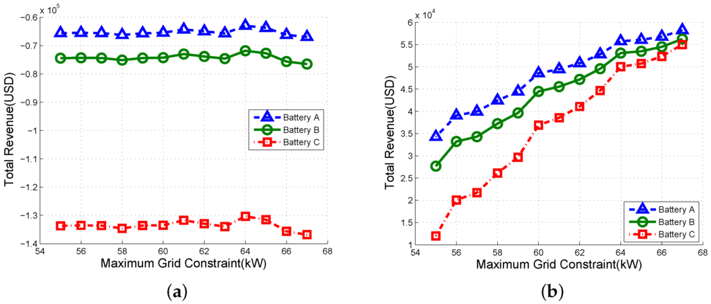 Figure 15 shows the total revenue with maximum grid constraints for three kinds of batteries. In Figure 15a, the ESS is fully utilized to maximize profits from TOU, DR and peak shift, and this results in increased battery cost. As a result, we observe that total revenue is always negative regardless of if battery wear-out is not considered. Figure 15b shows that the total revenue increases in order of battery A, B and C as increases. This is due to decreasing of reserved capacity for peak shift resulting in low battery cost, and this leads to positive total revenue. In particular, we verify that total revenue is inversely proportional to the value of wear-out function as can be seen in Figure 3.