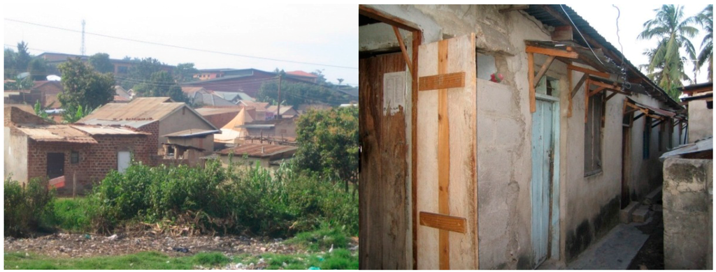 Around 62% of homes in Uganda are covered with iron sheets (Figure 2) and 37% have thatched roofs. Brick walling is the most common walling material (57%) followed by mud and poles (39%). With a share of over 70%, cement/concert flooring is the most common flooring method/material in urban areas of the country [6,16]. The available data indicate that there is a growing shift away from traditional materials (such as adobe and thatch) towards relatively modern methods and materials (such as bricks and iron sheets) [12,13].