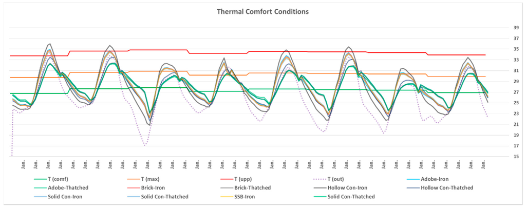 Figure 3 compares the performance of the tested scenarios over a hot summer week during the 24th to 31st of January. According to the results, the most critical factor affecting occupants’ thermal comfort in the studied scenarios is the roof construction method/material. Apart from hollow concrete blocks, all walling methods with thatched roofs passed the thermal comfort requirements (passed at least two criteria out of three). For iron sheet roofing, buildings failed all three thermal comfort criteria regardless of walling method/material.