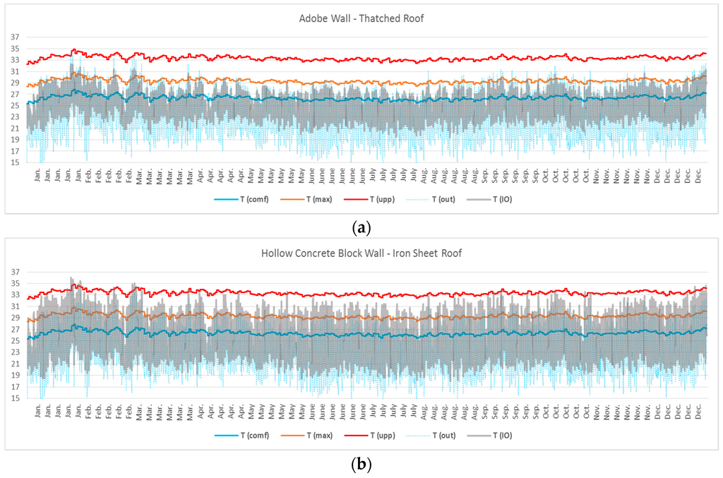Hollow concrete blocks had an extremely poor performance despite their lower thermal conductivity (0.86 W/m·K) compared to bricks (1 W/m·K). Indeed, hollow concrete block walls failed the requirements regardless of roofing materials. The risk of overheating and thermal discomfort was, however, considerably higher for the iron sheet roof. According to the results, for the iron sheet roof, the building was thermally uncomfortable for 13.7% of occupied periods. Moreover, We was above the acceptable limit for 148 days (41% of the entire year) with the maximum value of 35 °C·h (degree-hours) on the 24th of January. There were 39 incidents during which ∆T exceeded the upper limit temperature (Tupp), which means that the building also failed Criterion 3. Replacing iron sheets with thatch helped to pass Criterion 3, although the building still failed Criterion 1 and Criterion 2.