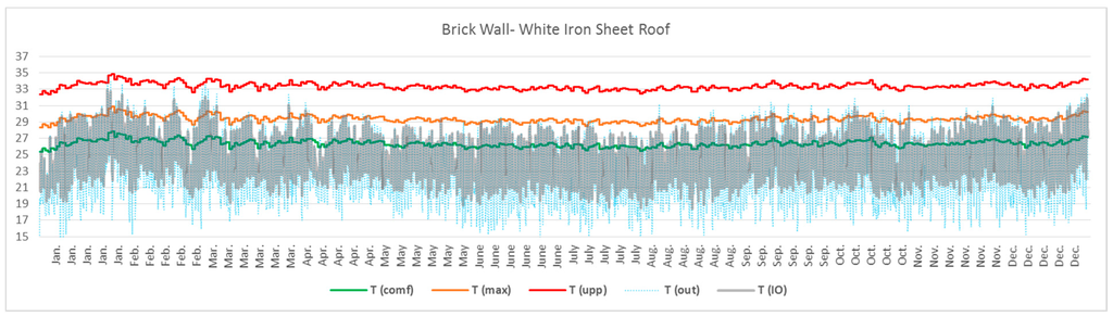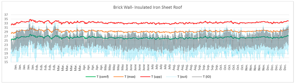 Roof insulation also improved the conditions. Both insulated ceiling and insulated roof achieved almost the same results. According to the results, for insulated iron sheet roof, the building was thermally uncomfortable for 0.97% of occupied periods, and We exceeded the acceptable limit for seven days. The building passed Criterion 3 as ∆T never exceeded the upper limit temperature (Tupp). Figure 9 illustrates the results of simulations for brick walls with an insulated iron sheet roof.