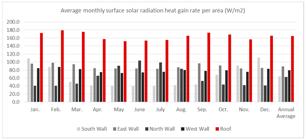 Moreover, according to Figure 12, the sun has a very high altitude during the entire year, which indicates considerably higher solar heat gain through the roof compared to other building elements. This is supported by Figure 13, which shows the average monthly and annual solar radiation rates per area for the walls and roofs.