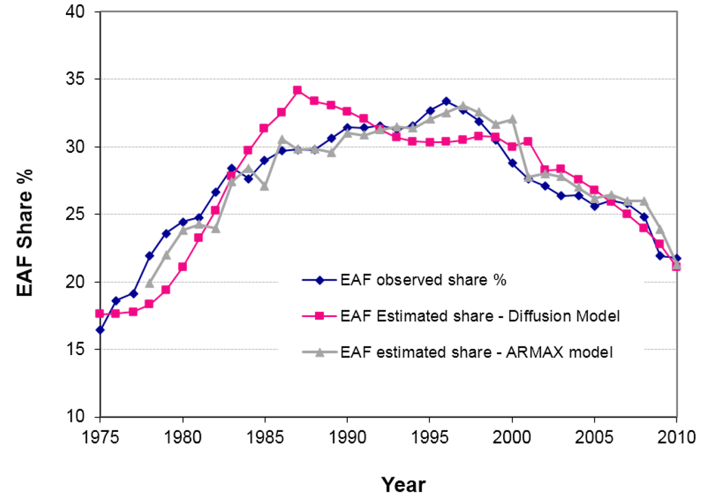 This adjustment shows that the evolution of the diffusion of the EAF can be explained using an ARMAX model with three explanatory variables. This model is able to reproduce the evolution of EAF production. The fact that the ARMAX model needs up to three and two previous values of the production and explanatory values, respectively, confirms the inertia of EAF production.