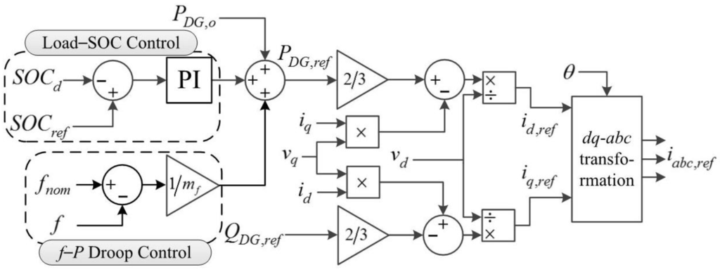 Figure 3 shows the control scheme of the primary SOC control DG unit, where ms is the droop coefficient (Figure 1), PDG,o is the dispatched active power, PDG,ref and QDG,ref are the PQ reference, respectively, vd and vq are d- and q-component output voltage, respectively, id and iq are d- and q-component output current, respectively, id,ref and iq,ref are the reference values of id and iq, respectively, θ is the reference angle of the grid-side d- and q-axis voltage, and iabc,ref is the reference current of the inverter of the DG. The control principle of the primary SOC control unit is shown in the following equation: