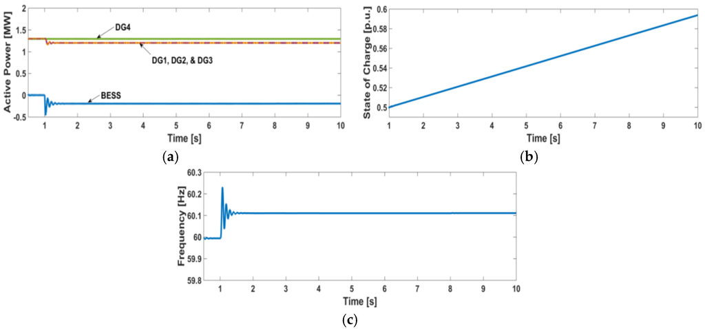 Figure 8 shows the simulation results of Case 2. As shown in Figure 8a, the active powers of the BESS, DG3 and DG4 are same as those of Case 1, whereas DG1 and DG2 does not equally share active power anymore. DG1 decreases its active power twice as much as DG2 does after the load change since their PI controller gains’ ratio is adjusted to 2:1. The SOC and the frequency are well maintained at the desired values as shown in Figure 8b,c, respectively.