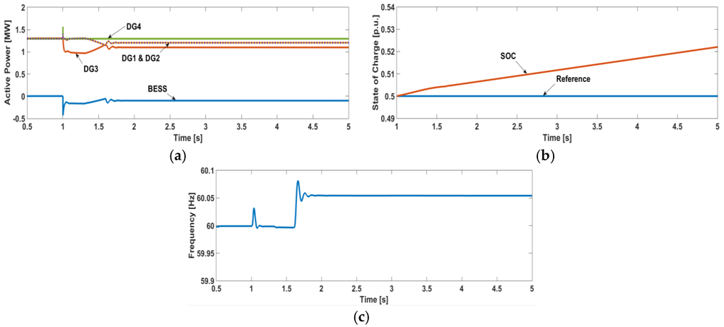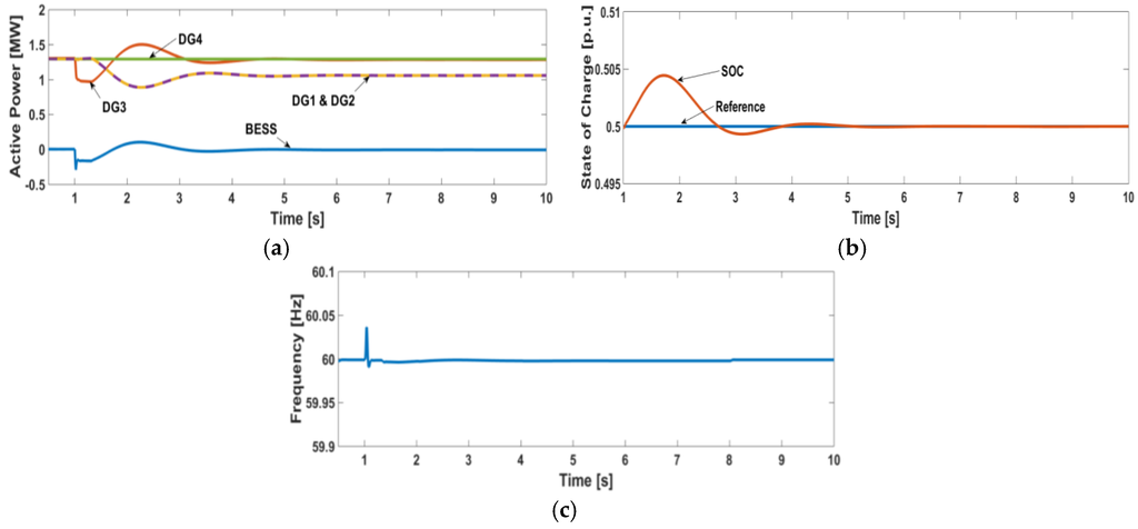 Figure 7 shows the simulation results with the proposed method. After a sudden load change at 1 s, the BESS responds to the load change and the primary SOC control unit (DG3) shares the transient load change. After a time delay of 0.3 s (a time that needs for the MGCC to give an SOC signal to the LCs), the secondary SOC control units (DG1 and DG2) responds to the SOC deviation and activated to restore the SOC. Since the PI gains of load-SOC controller (Figure 4) of DG1 and DG2 are same with each other, they equally share the active power. Consequently, the SOC is restored to its reference value after a few seconds with zero frequency deviation as shown in Figure 7b,c.